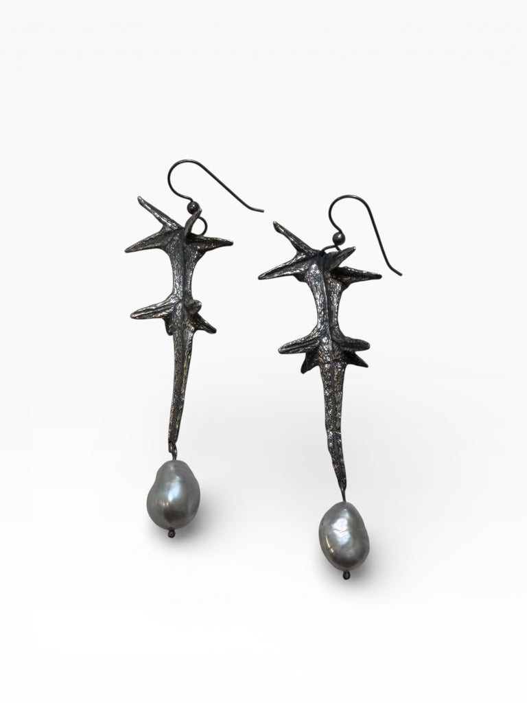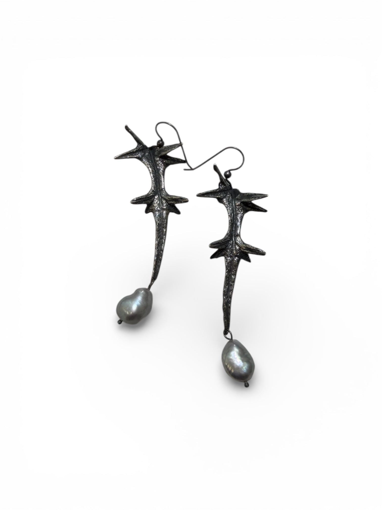Be big, take up space, be firm, stand tall, be spiky and fiercely protective of yourself. Why not be like the thistle.  Large drop earrings measure a bold 3” long and are cast directly from a thistle leaf collected in the Highlands of North Carolina. Cast in pure sterling silver, I’ve added large grey baroque pearls to add softness to the strong energy that comes from the protective thistle.