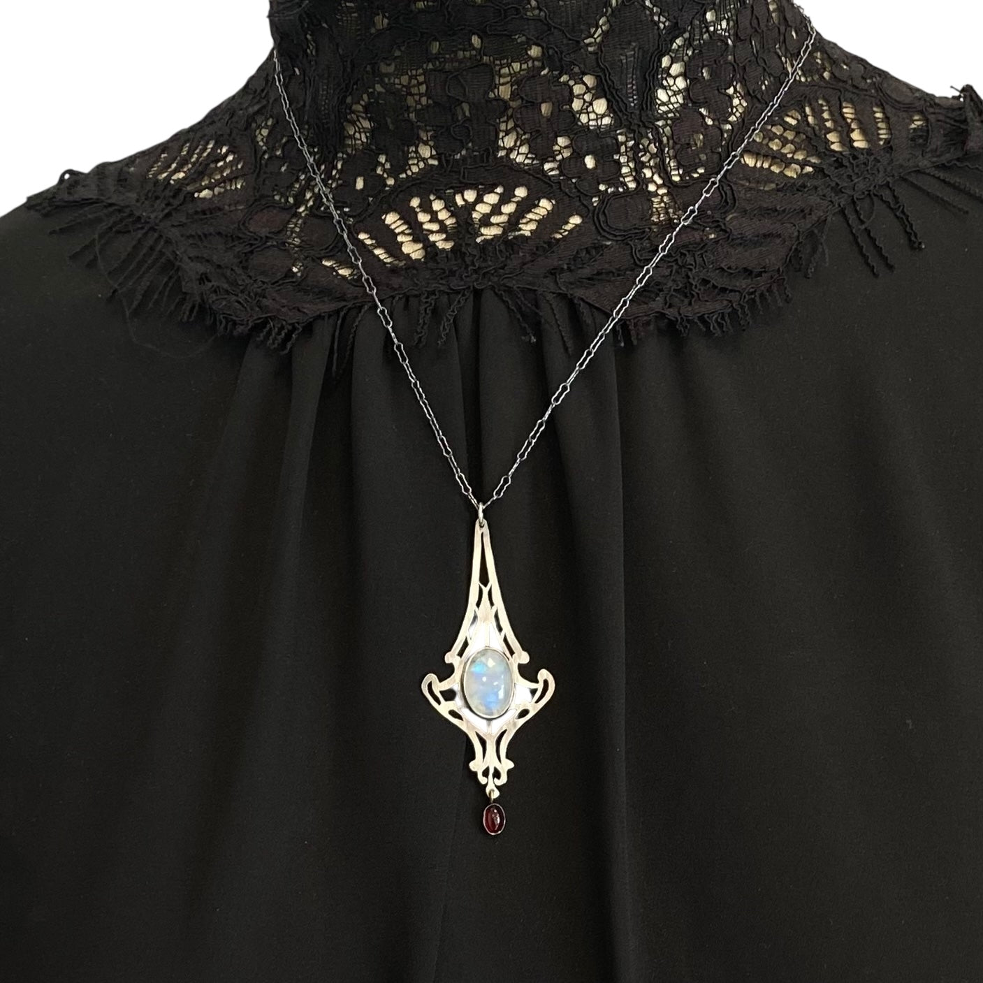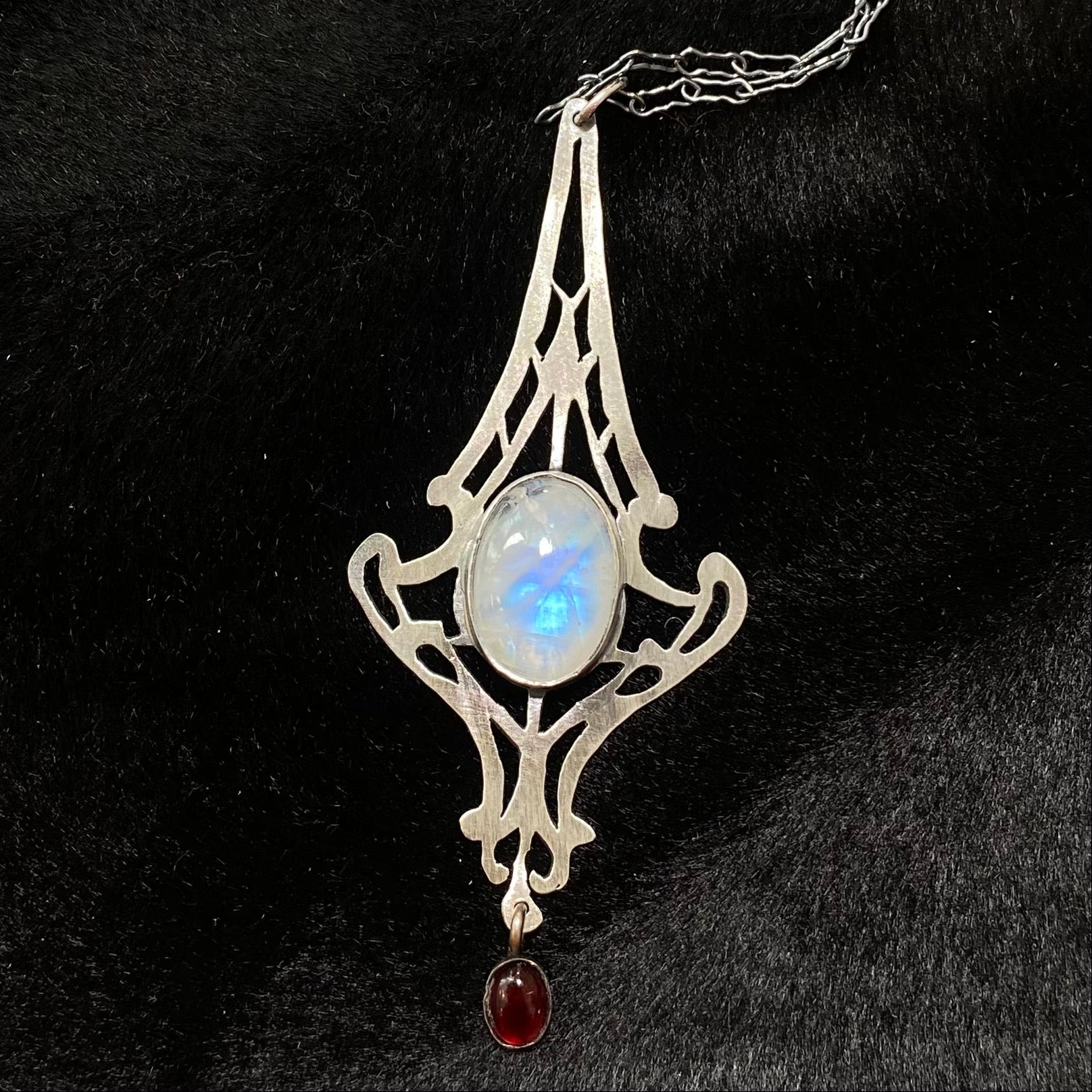 A sterling silver drop pendant of hand pierced sterling with moonstone and tiny garnet droplet, inspired by an illustration in a 1912 design and jewelry pattern book, this pendant on a delicate 18" sterling silver chain projects the old world elegance of another era.