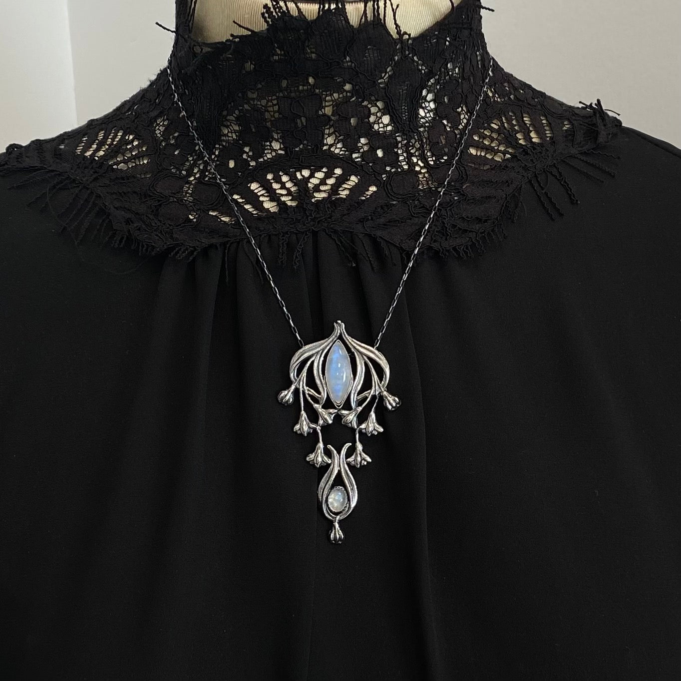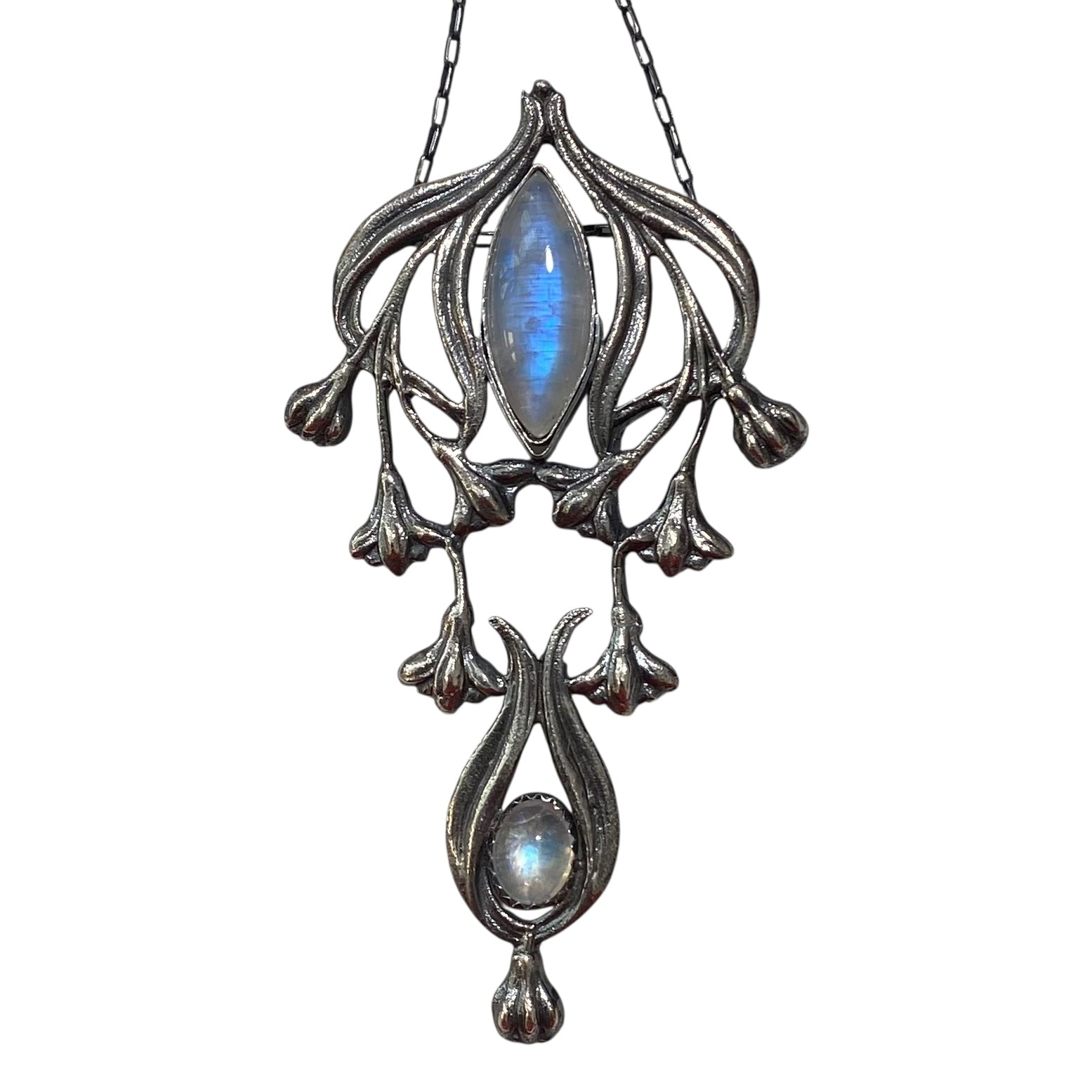 A sterling silver panel pendant of whiplash leaves and lotus blossoms with a pair of moonstones, inspired by an illustration in a 1912 design and jewelry pattern book, this long pendant on a delicate 18" sterling silver chain projects an elegance at perfect ease within nature.