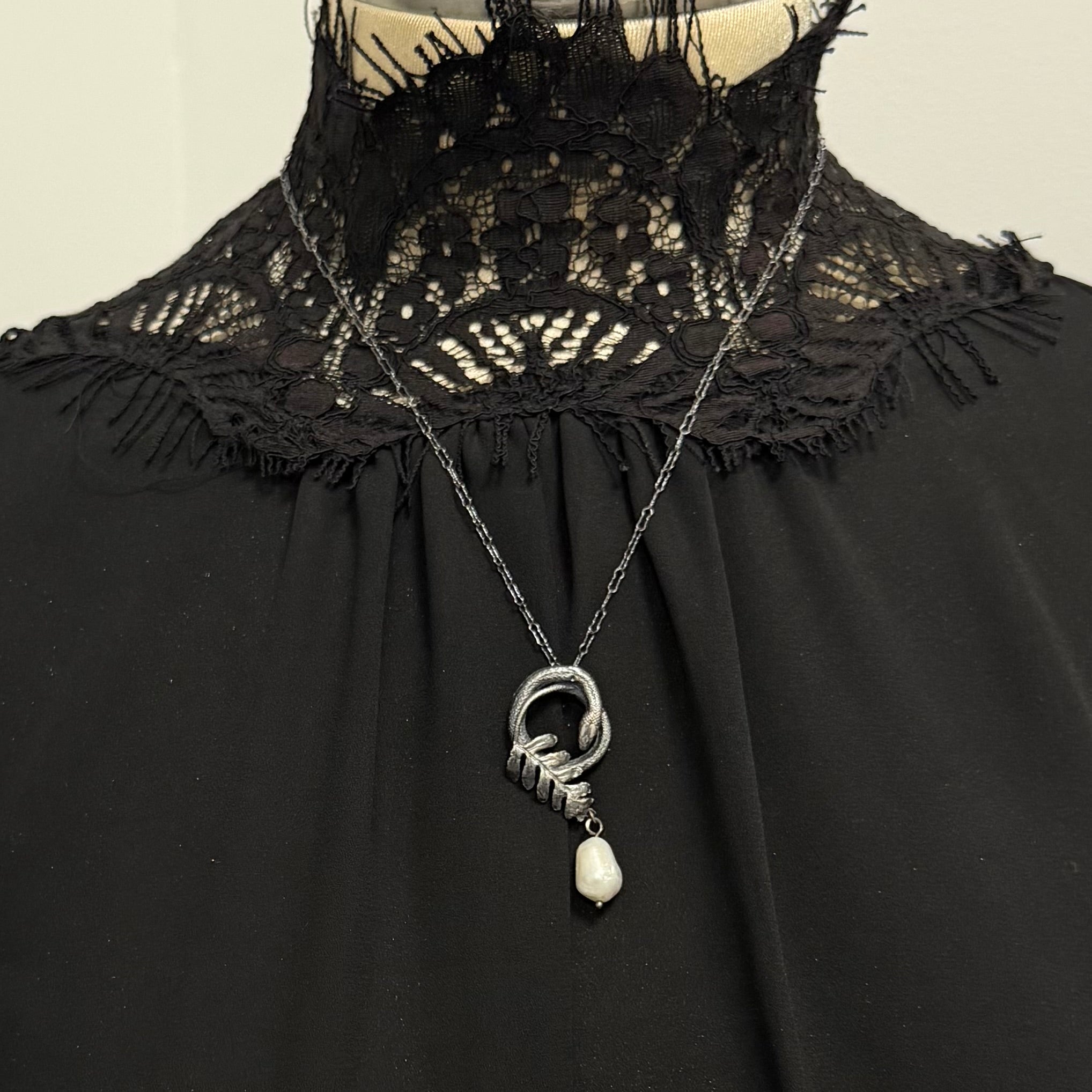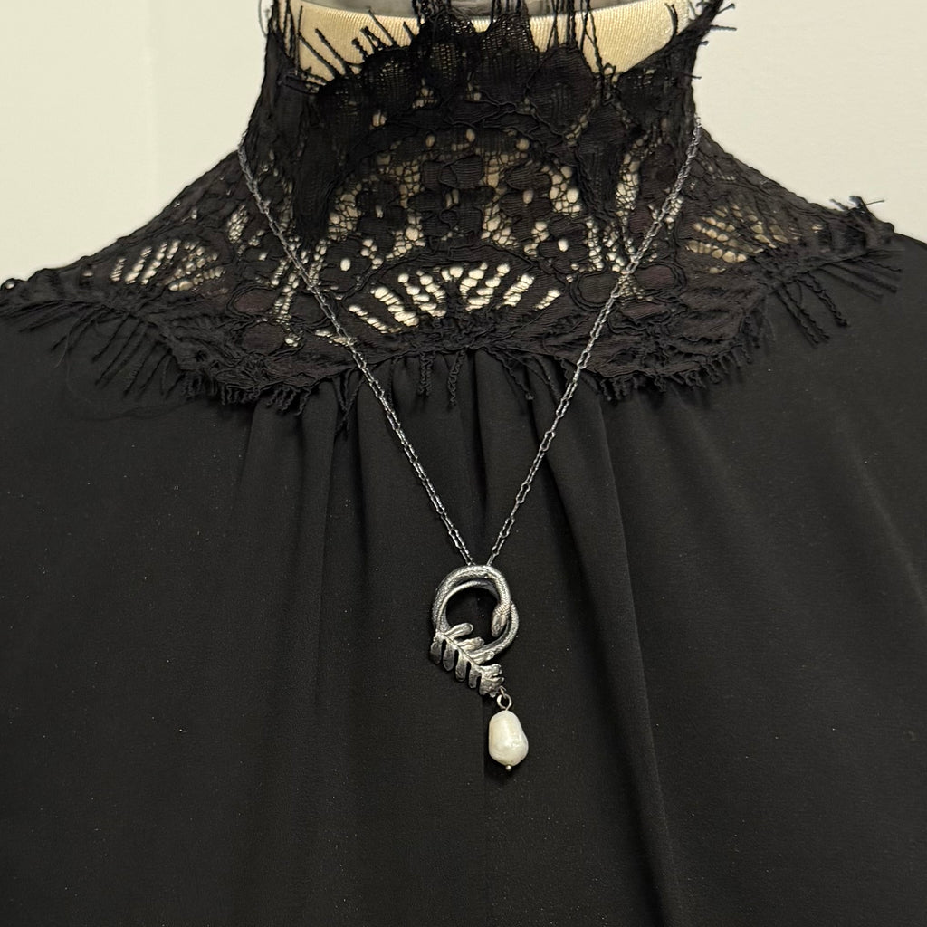 Sterling silver coiled serpent with a delicate cast of a natural fern hand collected in New Orleans La., this pendant represents rebirth and change as the seasons turn and renew throughout our lifetime. An organically shaped baroque pearl swings from the tip of the delicate fern. Each tiny snake and fern is hand created and no two are identical.
