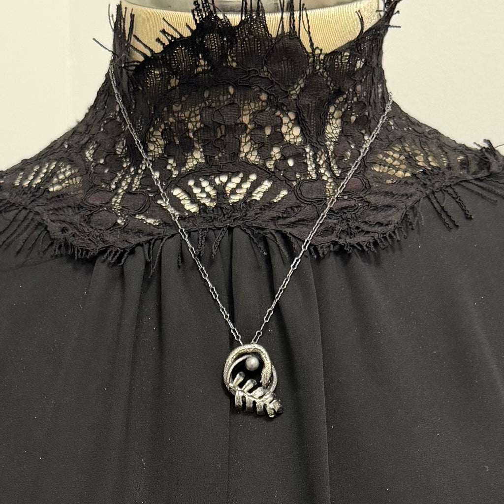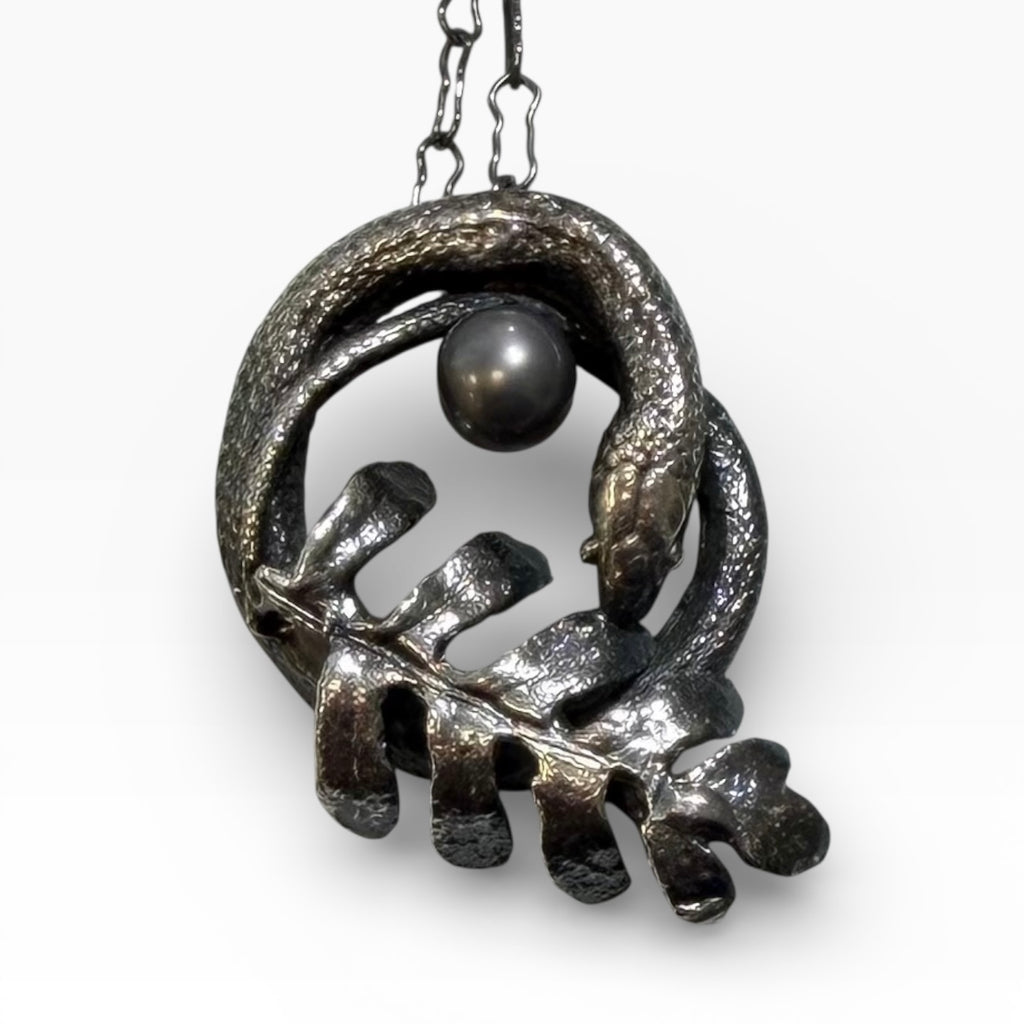Sterling silver coiled serpent with a delicate cast of a natural fern hand collected in New Orleans La., paired with a moody black pearl, this pendant represents rebirth and change as the seasons turn and renew throughout our lifetime. Each tiny snake and fern is hand created and no two are identical.