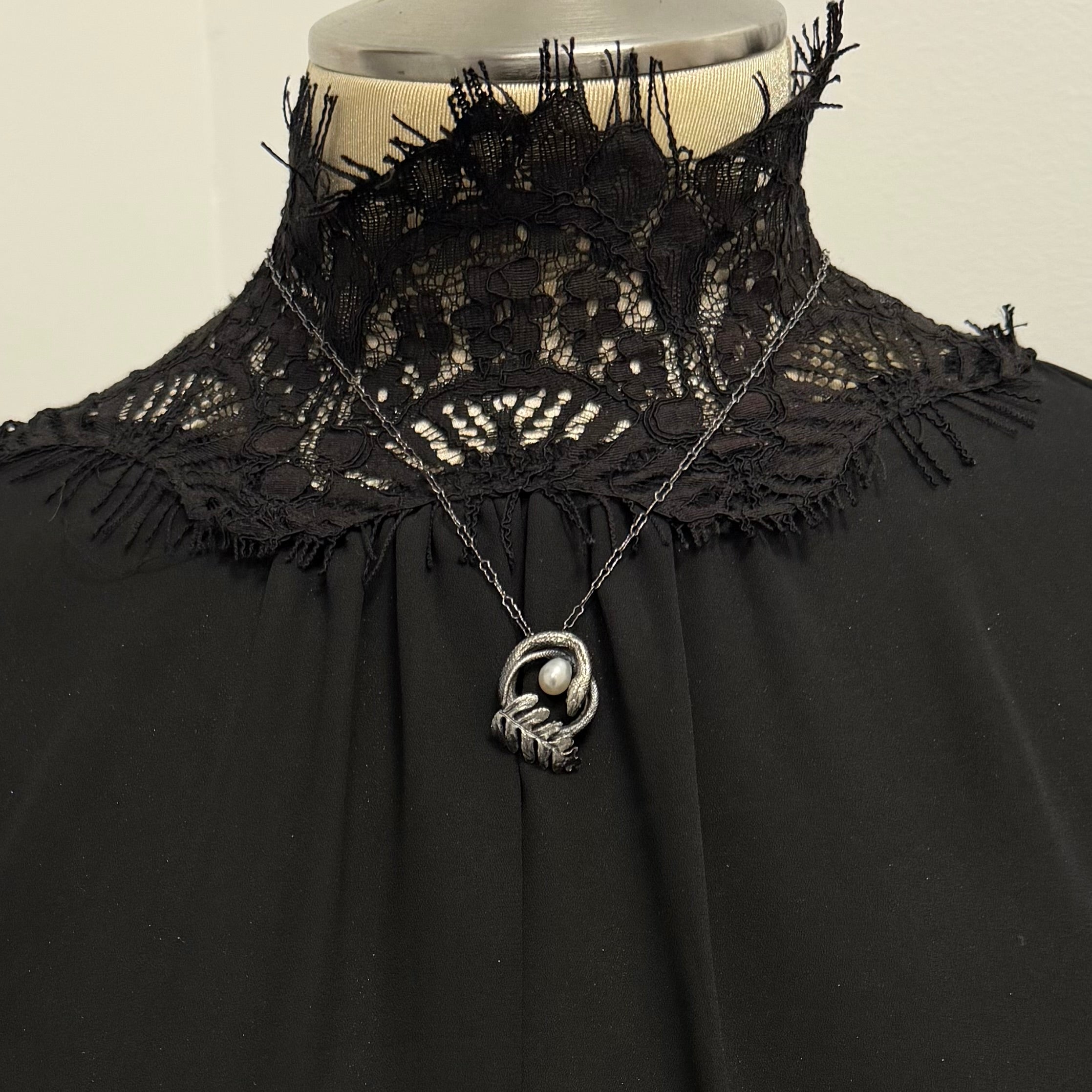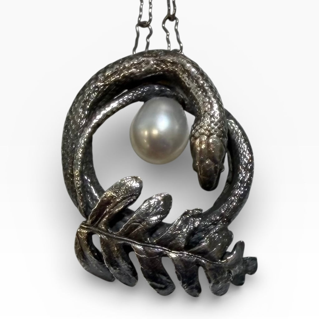 Sterling silver coiled serpent with a delicate cast of a natural fern hand collected in New Orleans La., this pendant represents rebirth and change as the seasons turn and renew throughout our lifetime. This pendant has a glowing white pearl held within the snake's embrace. Each tiny snake and fern is hand created and no two are identical.