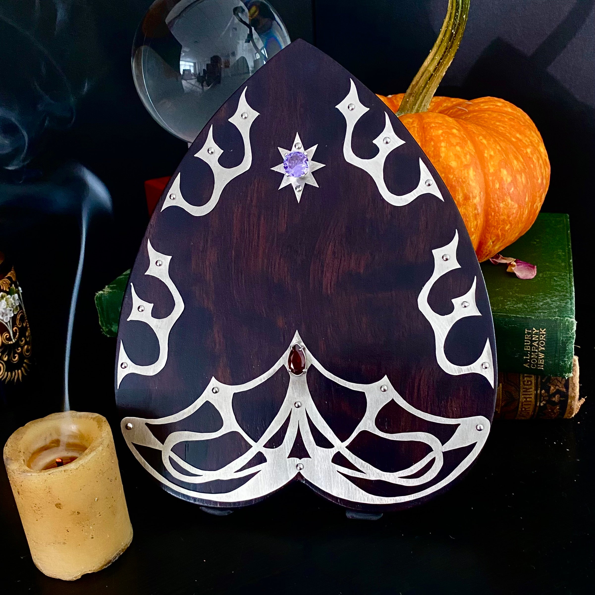 Entirely handmade in the Chase and Scout studio, this special planchette can be used for automatic writing or in conjunction with your favorite talking board. Made of mahogany, nickel and sterling silver, this board is set with a marquis cut garnet and a color changing topaz. Board measures 7.5" x 6" and can support up to 6 hands although she glides beautifully with a single guide.