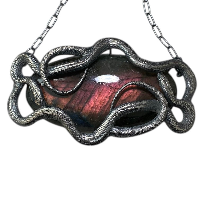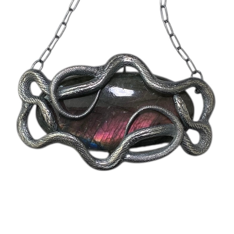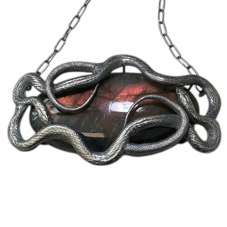 A Classic Chase and Scout design, this double serpent pendant holds a deep rose purple labradorite and is suspended on a sturdy 18" sterling chain, the chain I use allows the wearer to adjust the chain length by clipping the clasp anywhere along the chain.