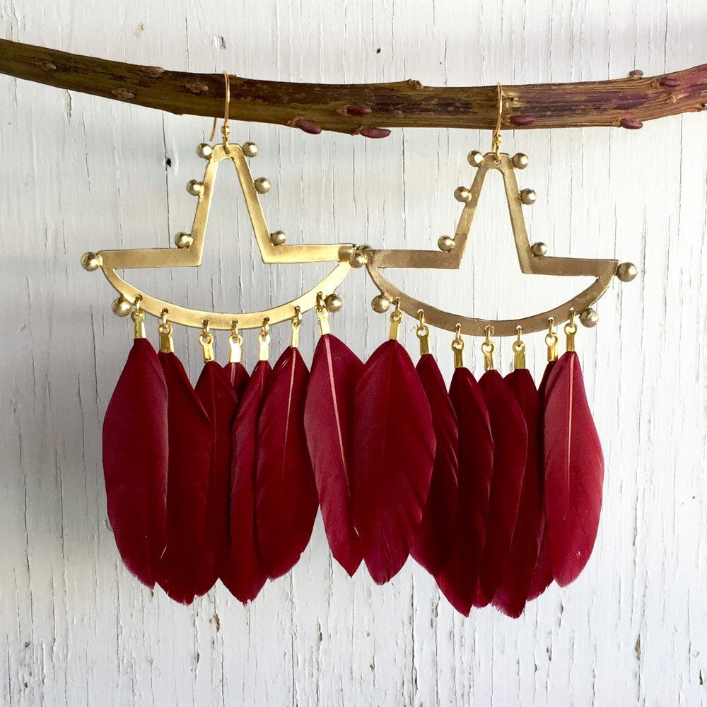 Tumi Earrings in Bronze with Crimson Feathers