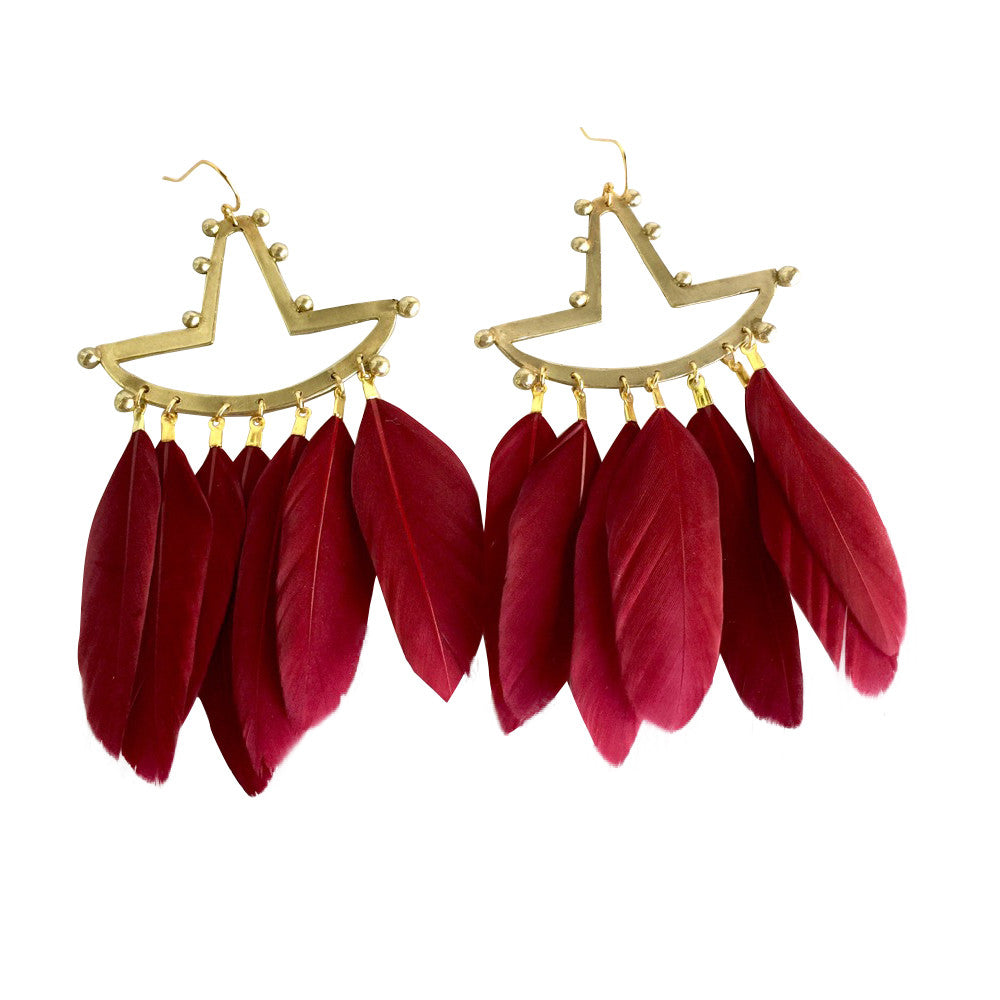 In Andean mythology, the Incas were descendants of the Sun, who was worshiped in an annual ritual. During the celebration, the Tumi knife served as the high priest's sacrificial knife and serves as the inspiration behind this design. Not for the faint at heart, these earrings are show stoppers sure to become a regular in your collection. Choose your favorite feather color from Crimson, Black, or Cobalt.