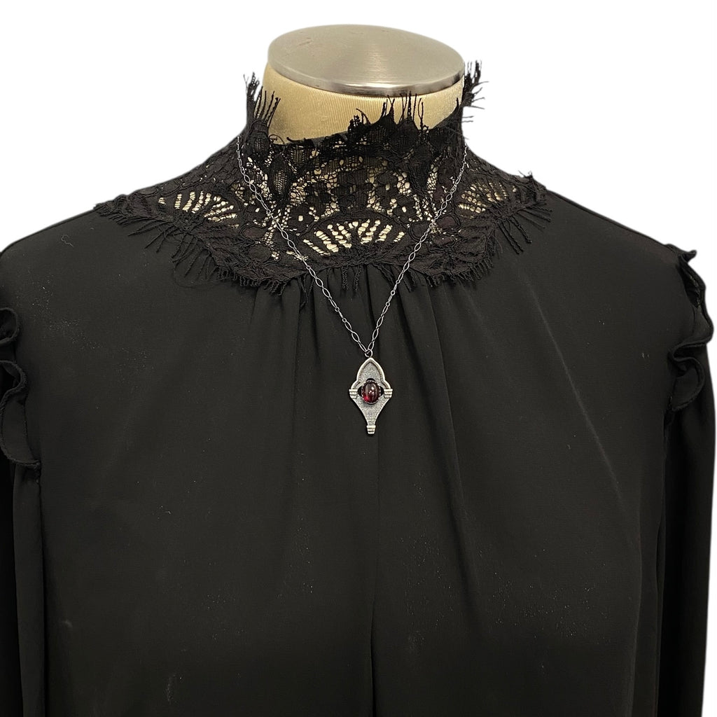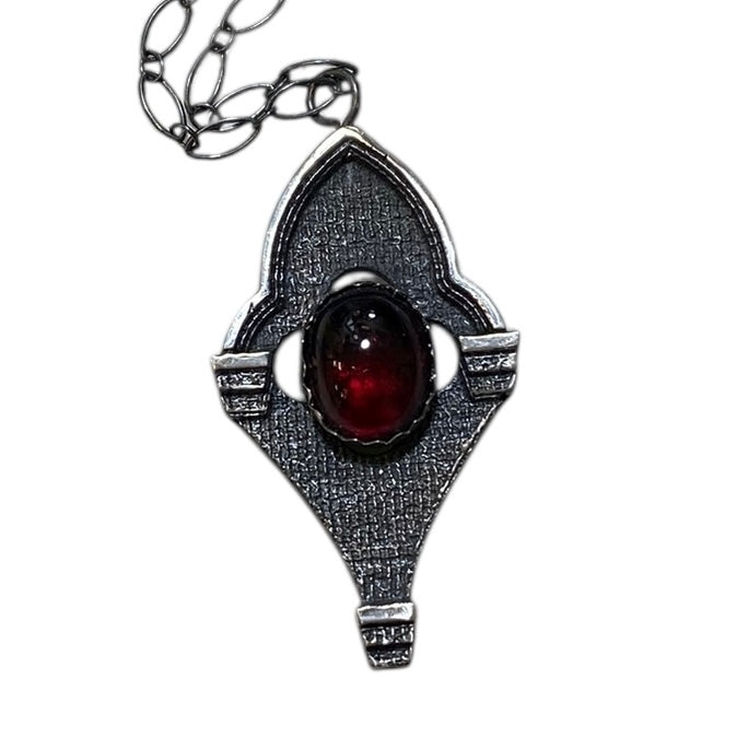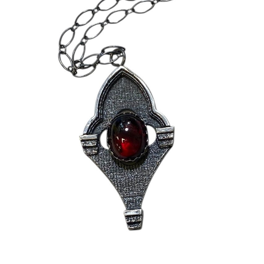 A Simple gothic arch in sterling is meant to evoke a place of whispered remembrances and the hallowed ground surrounding a crumbling churchyard. A softly textured surface recalls hand hewn stone and holds a dark surface patina, set with a glittering crimson garnet. Made for layering, this pendant is on an 18" sterling chain pendant.