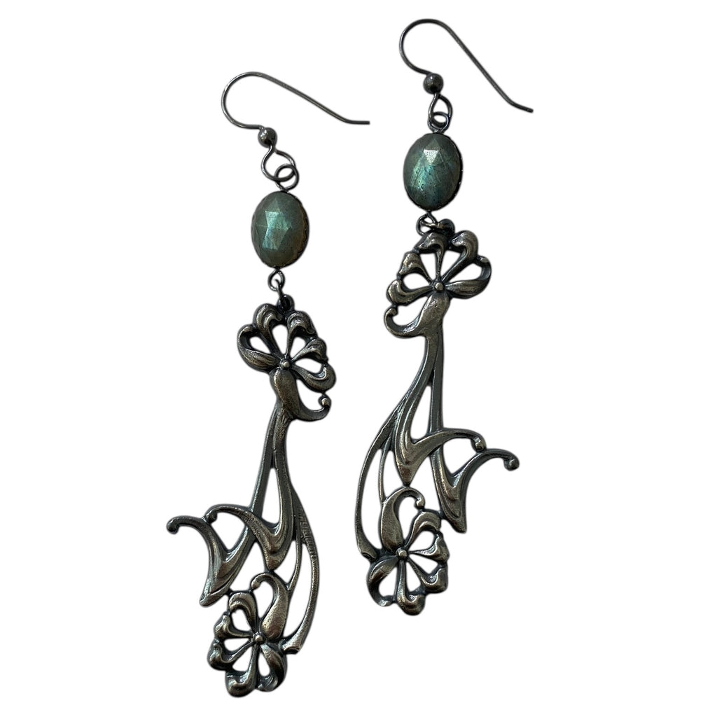 Solid sterling silver shoulder dusters with the sweeping lines of the Art Nouveau era. Inspired by a 1908 illustration, these drops are cast in sterling and paired with faceted labradorite cabochons. See last image for size example Earrings are 3" long and truly lovely.