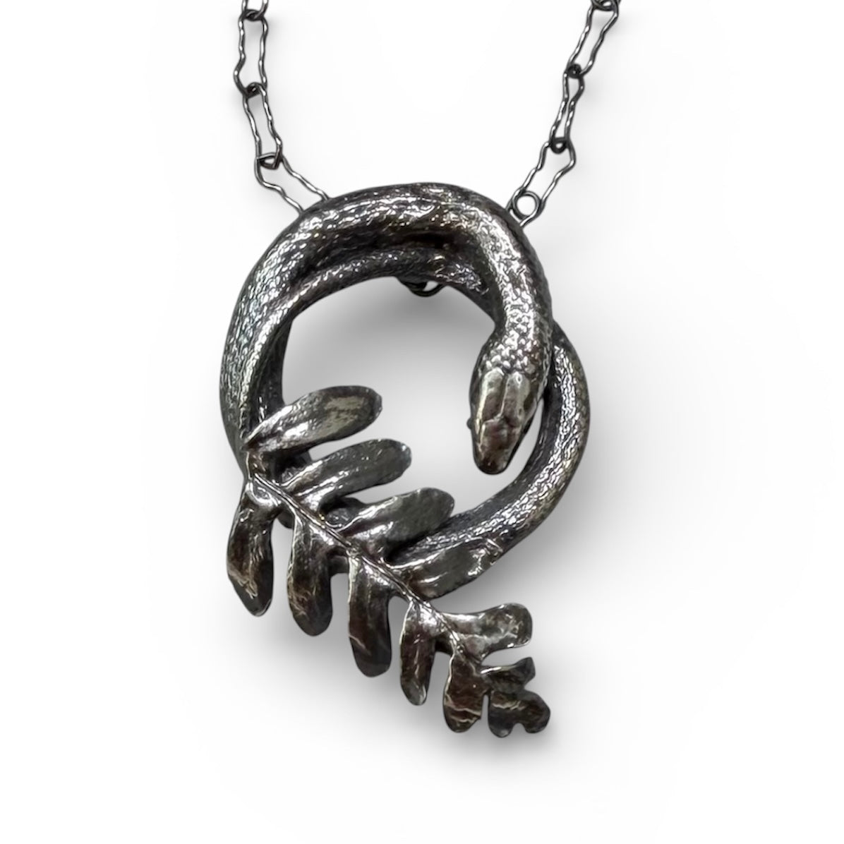 Sterling silver coiled serpent with a delicate cast of a natural fern hand collected in New Orleans La., this pendant represents rebirth and change as the seasons turn and renew throughout our lifetime. Each tiny snake and fern charm is hand created and no two are identical.