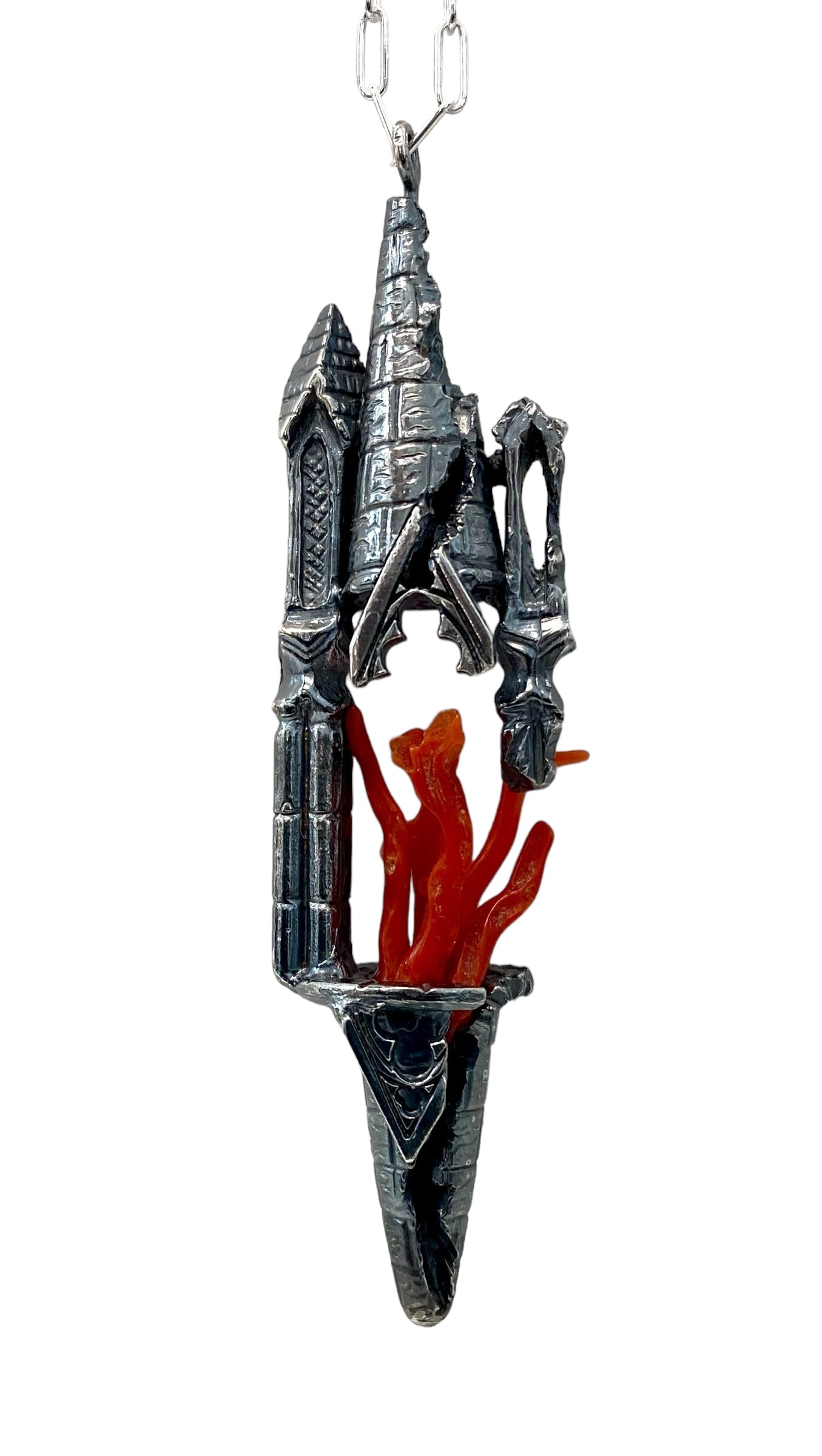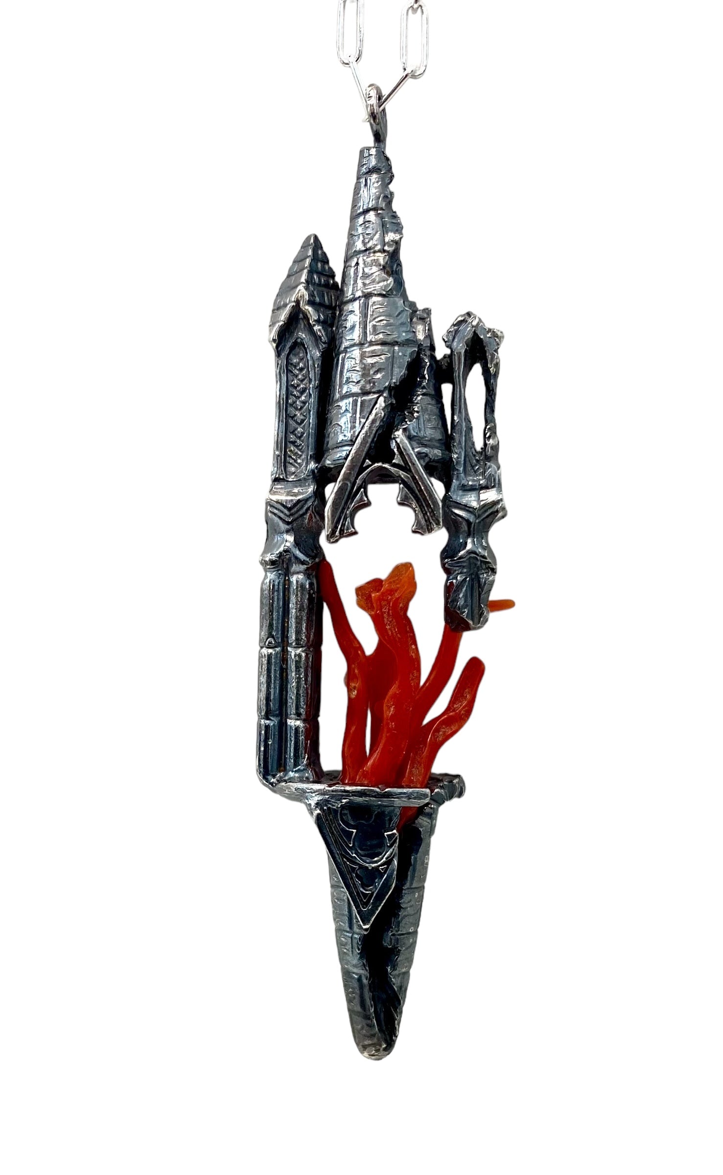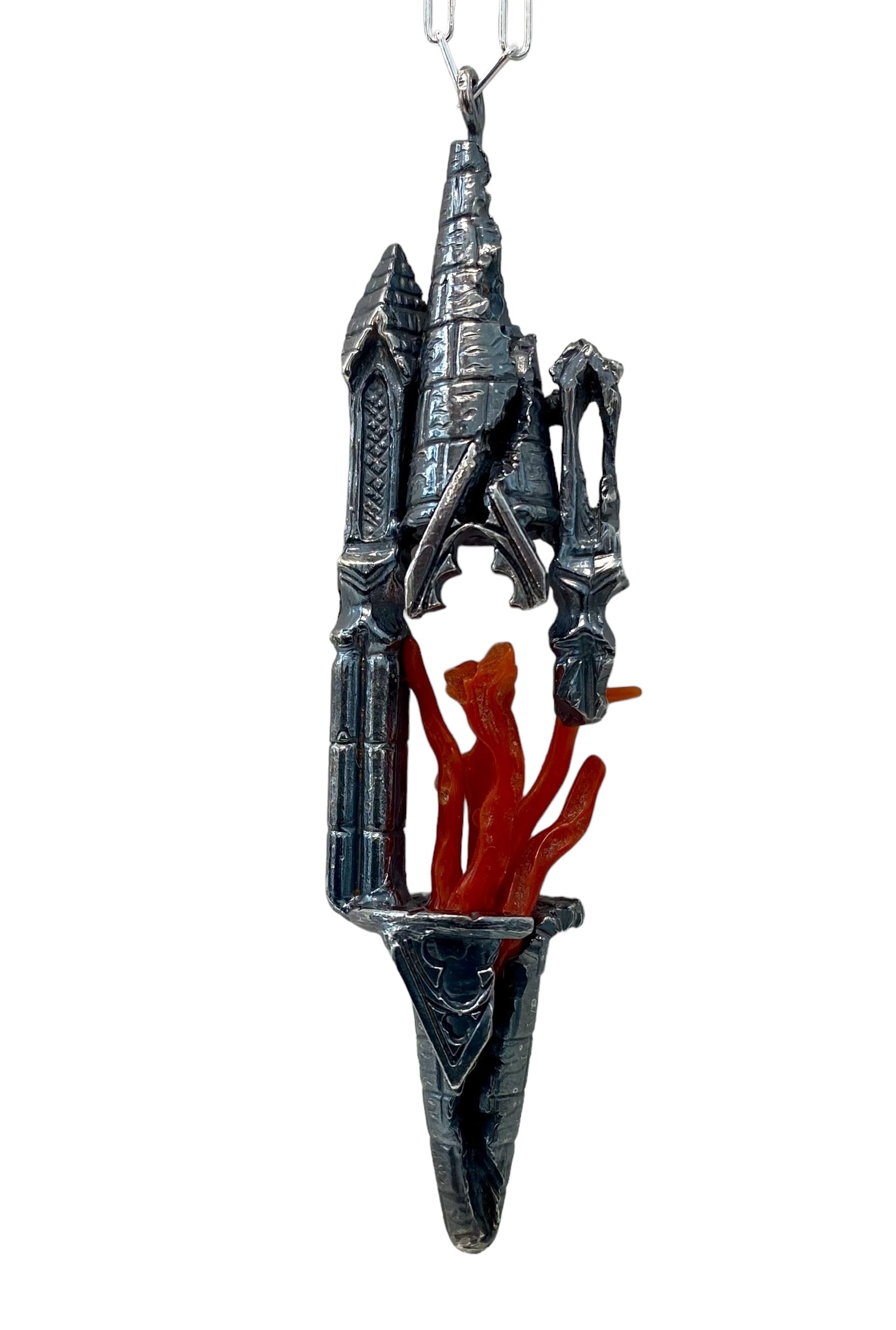 A custom carved Tower piece per customer’s request and discussed online. To be cast in sterling silver, flames to be determined/chain length to be determined.