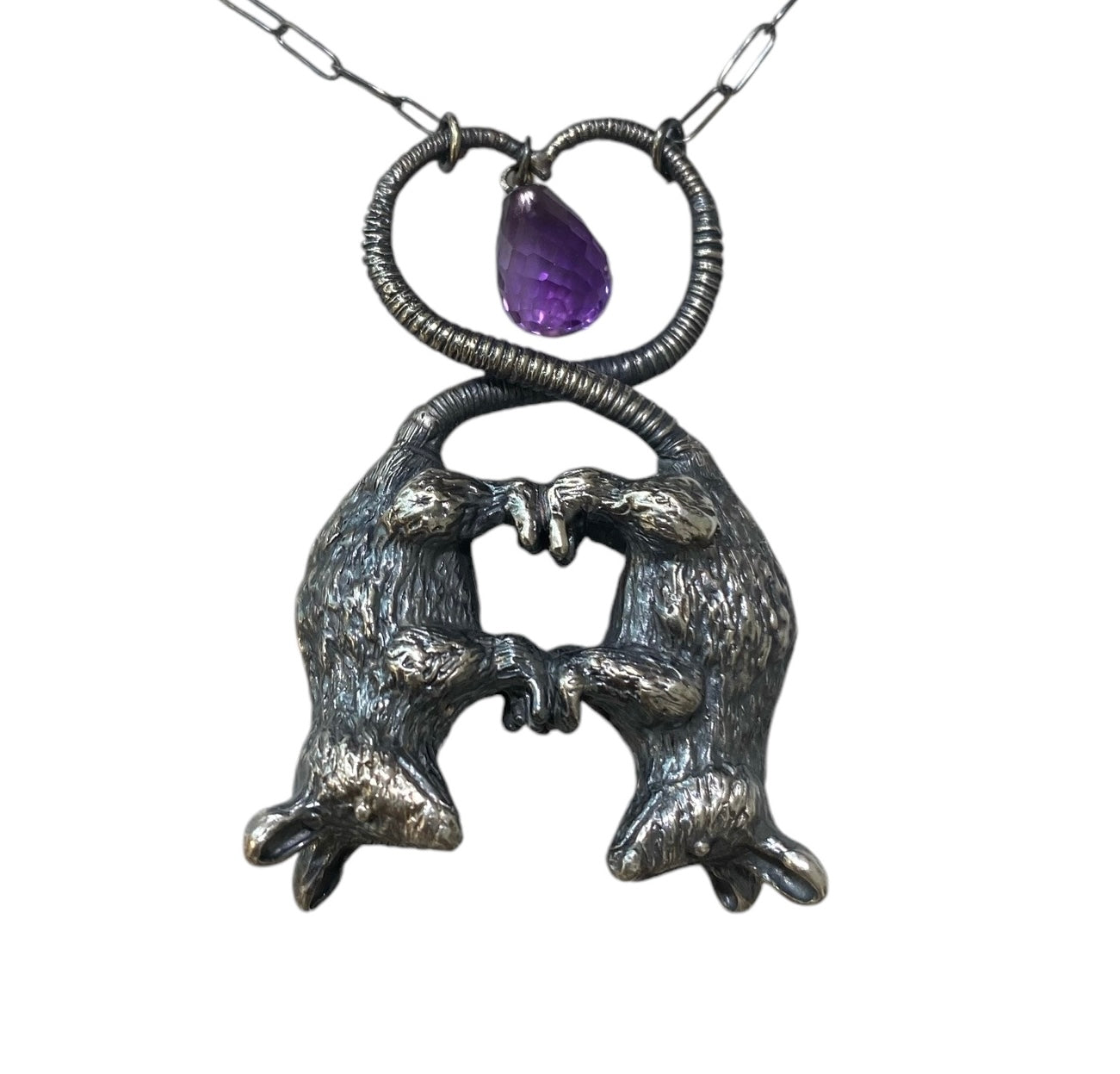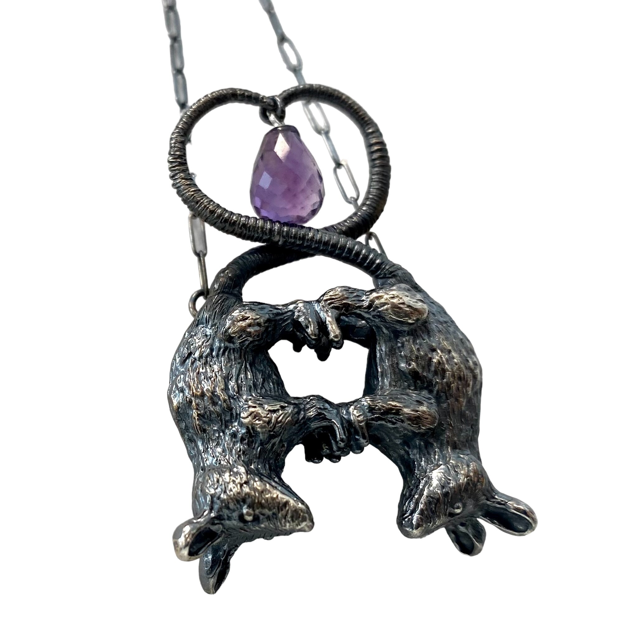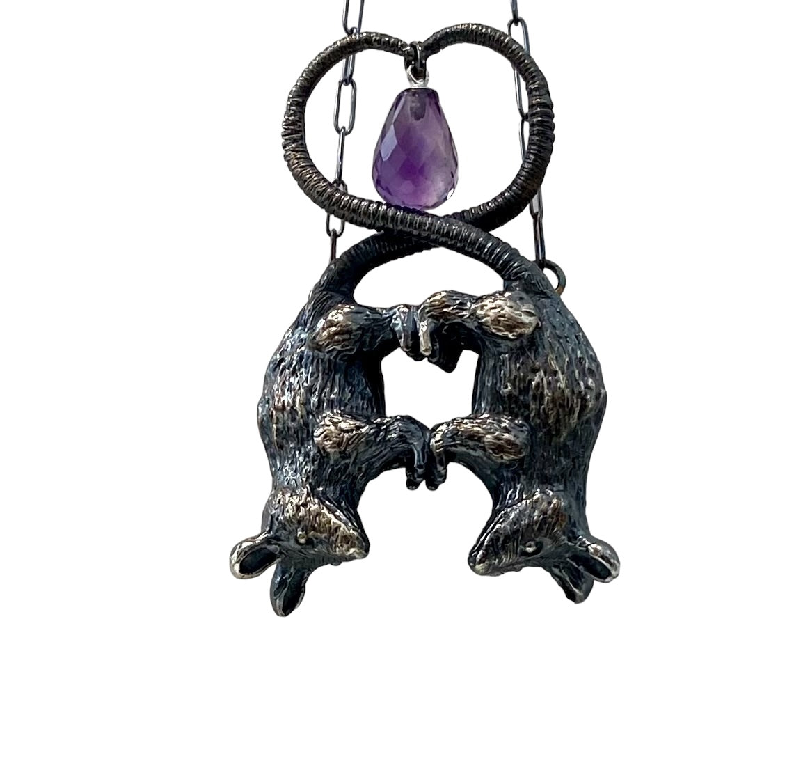 Double darling possums, hand sculpted to be cast in sterling silver and paired with an amethyst briolette.