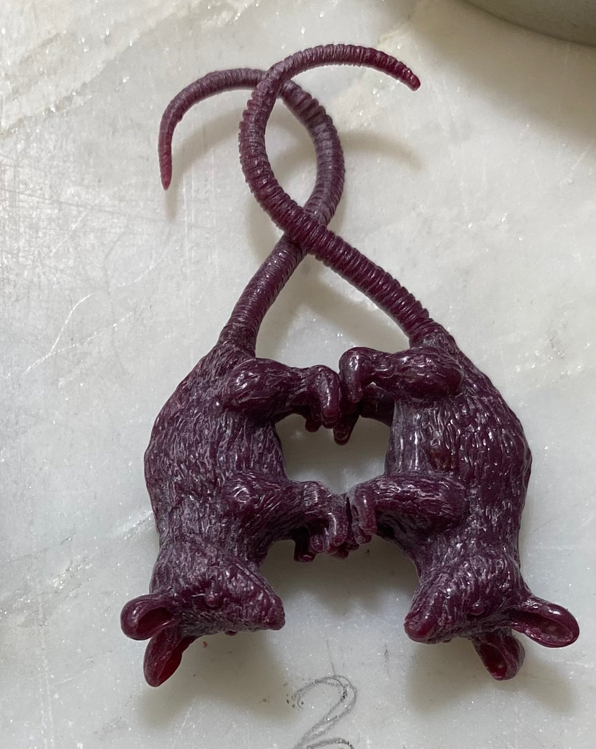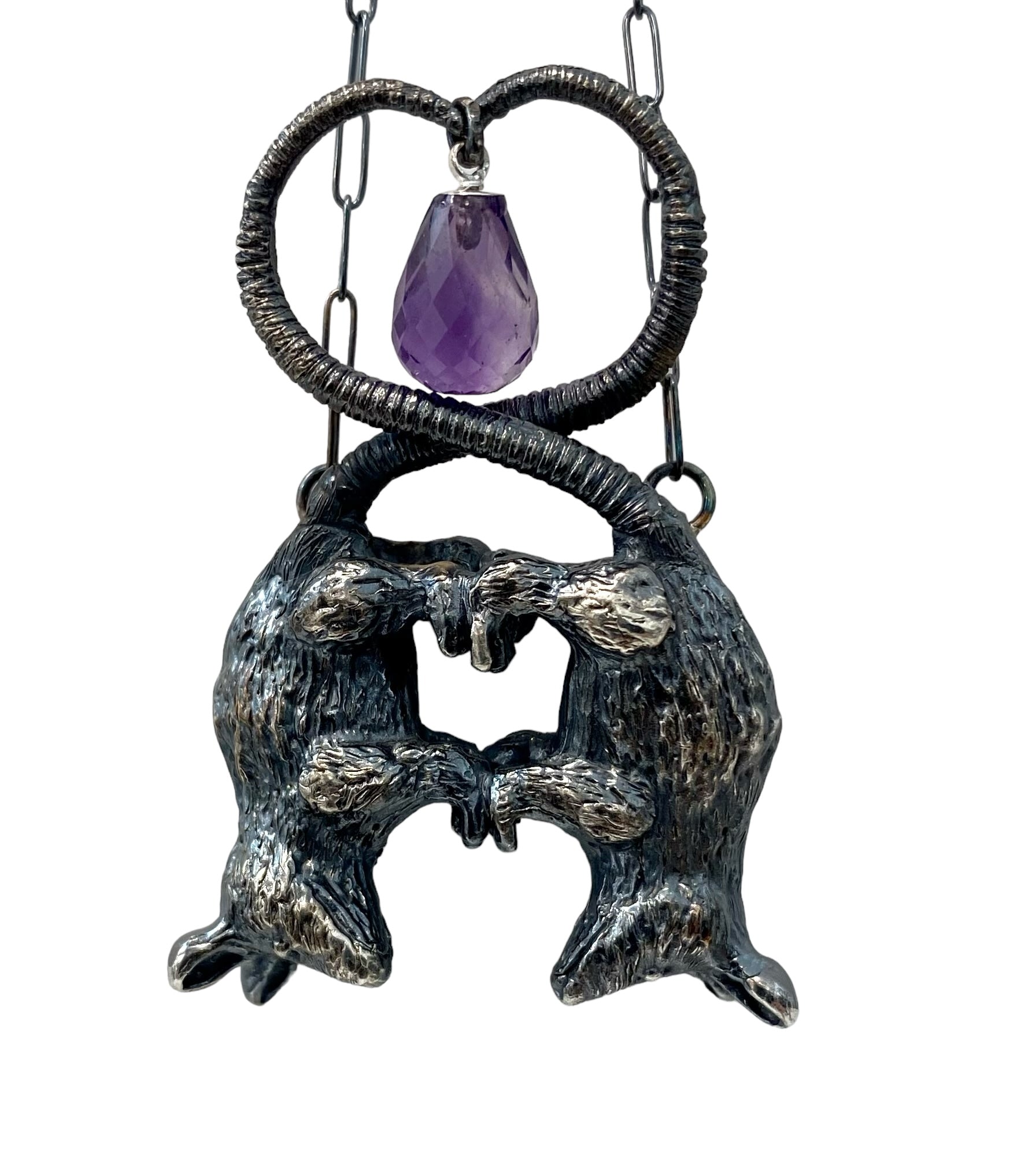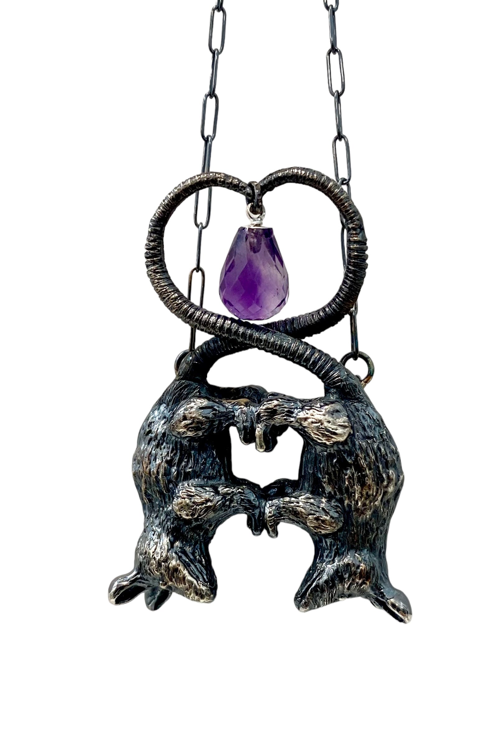 Double darling possums, hand sculpted to be cast in sterling silver and paired with an amethyst briolette.