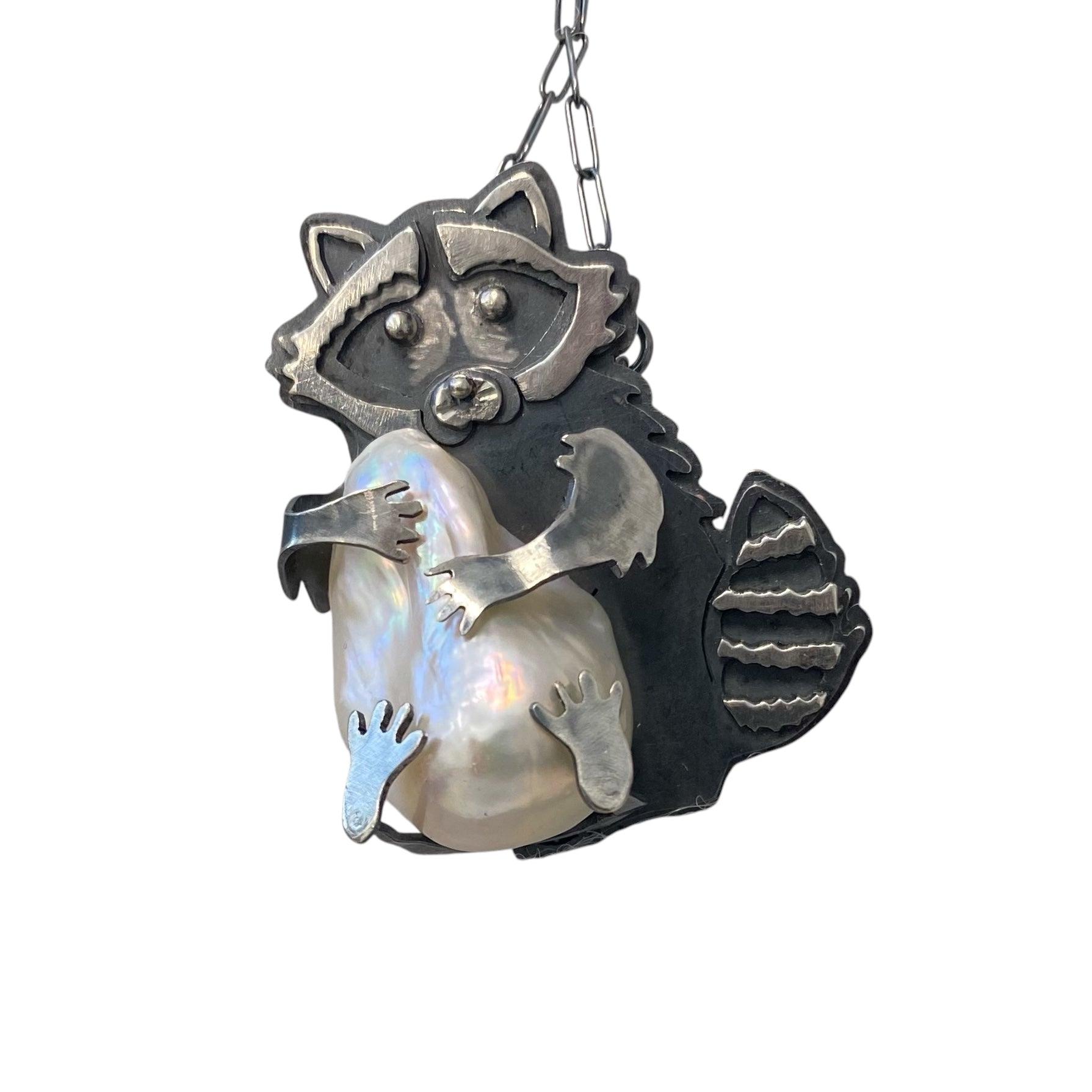 Raccoon clutching a pearl "garbage bag" custom sterling pendant as discussed on 16" chain.