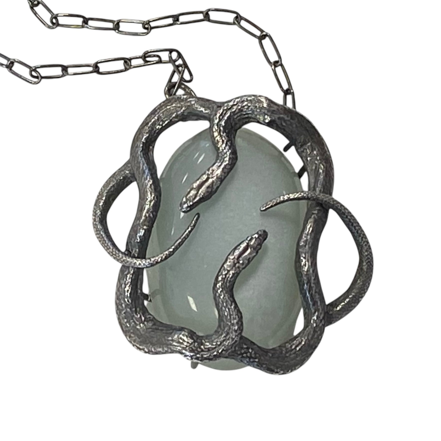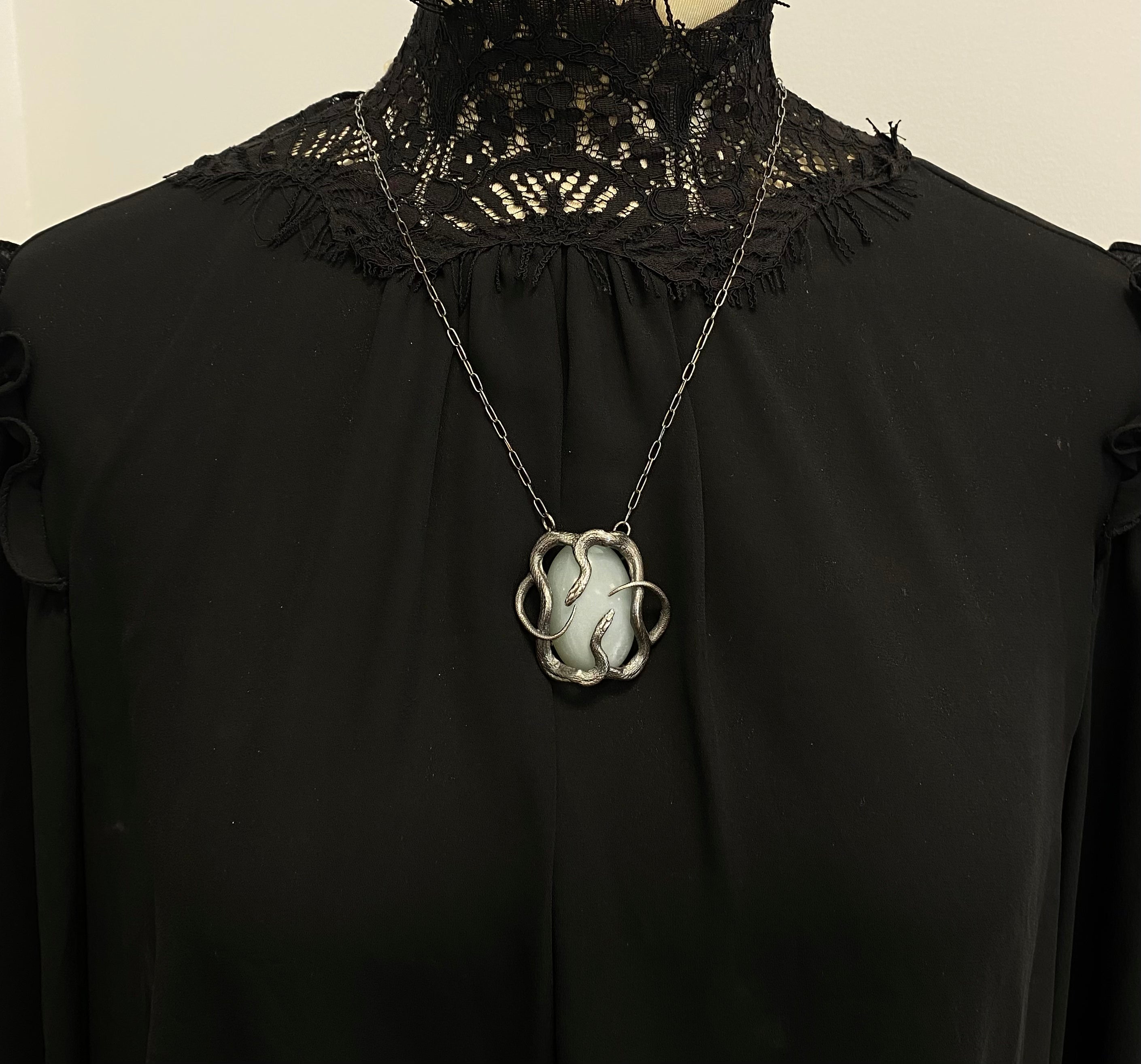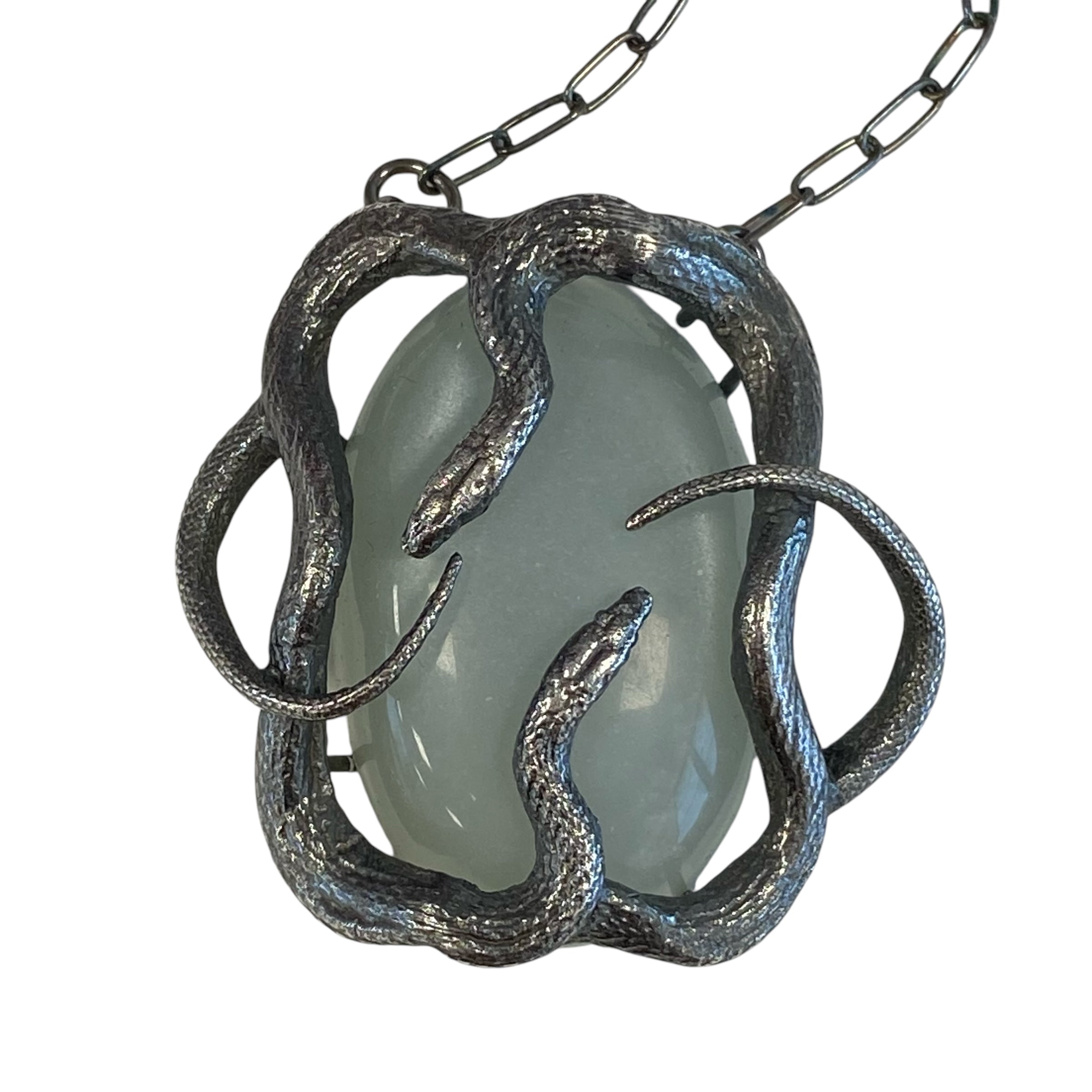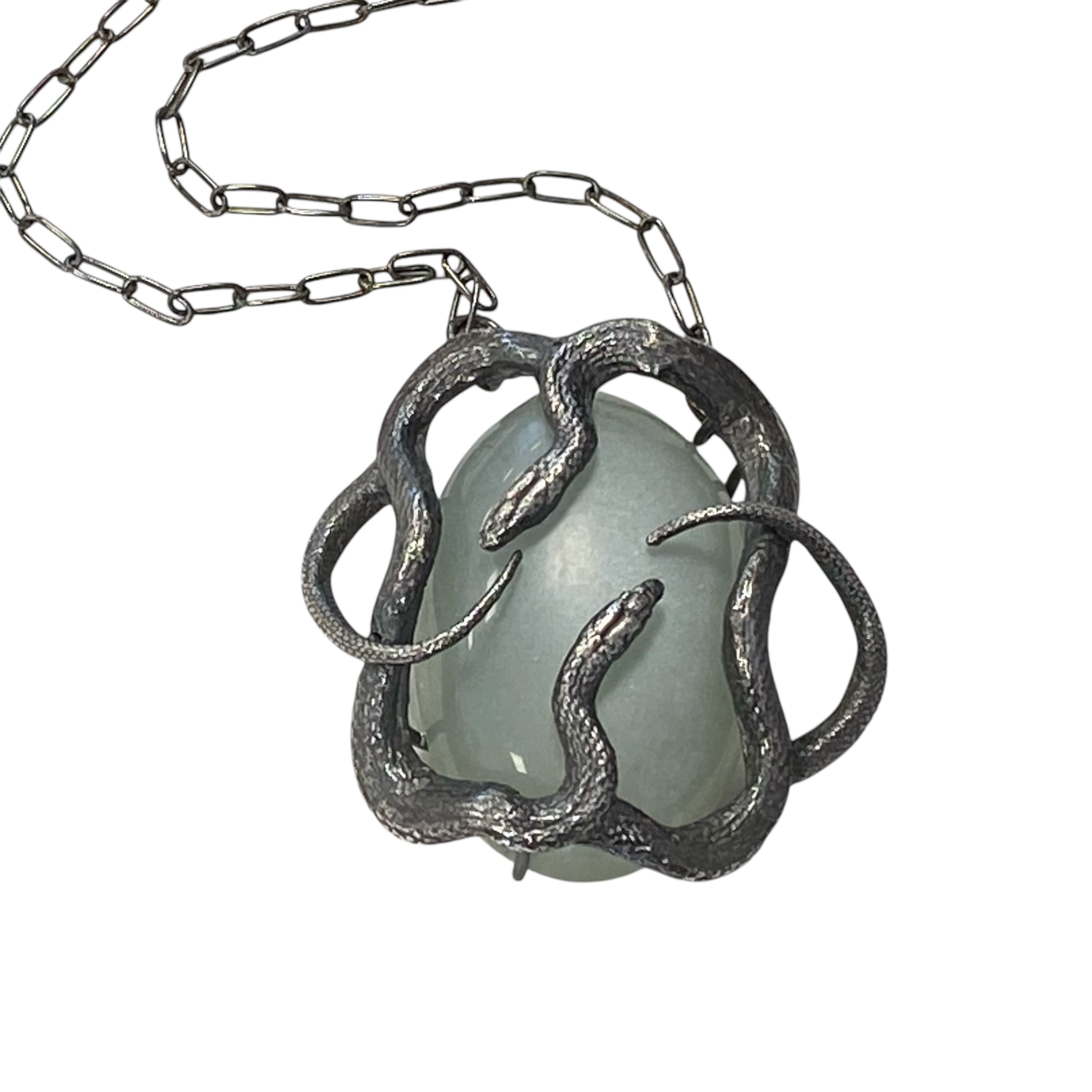 Double serpents cast in sterling silver coil around a grey moonstone that glows softly depending upon the light source and suspended on a 20" chain. Ready to ship and arrives in a black velvet box.
