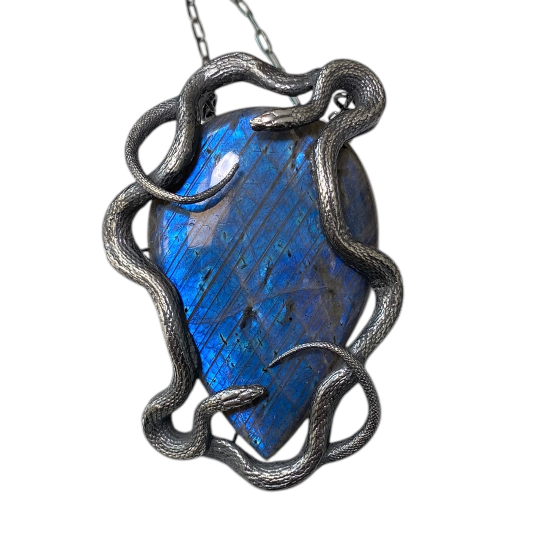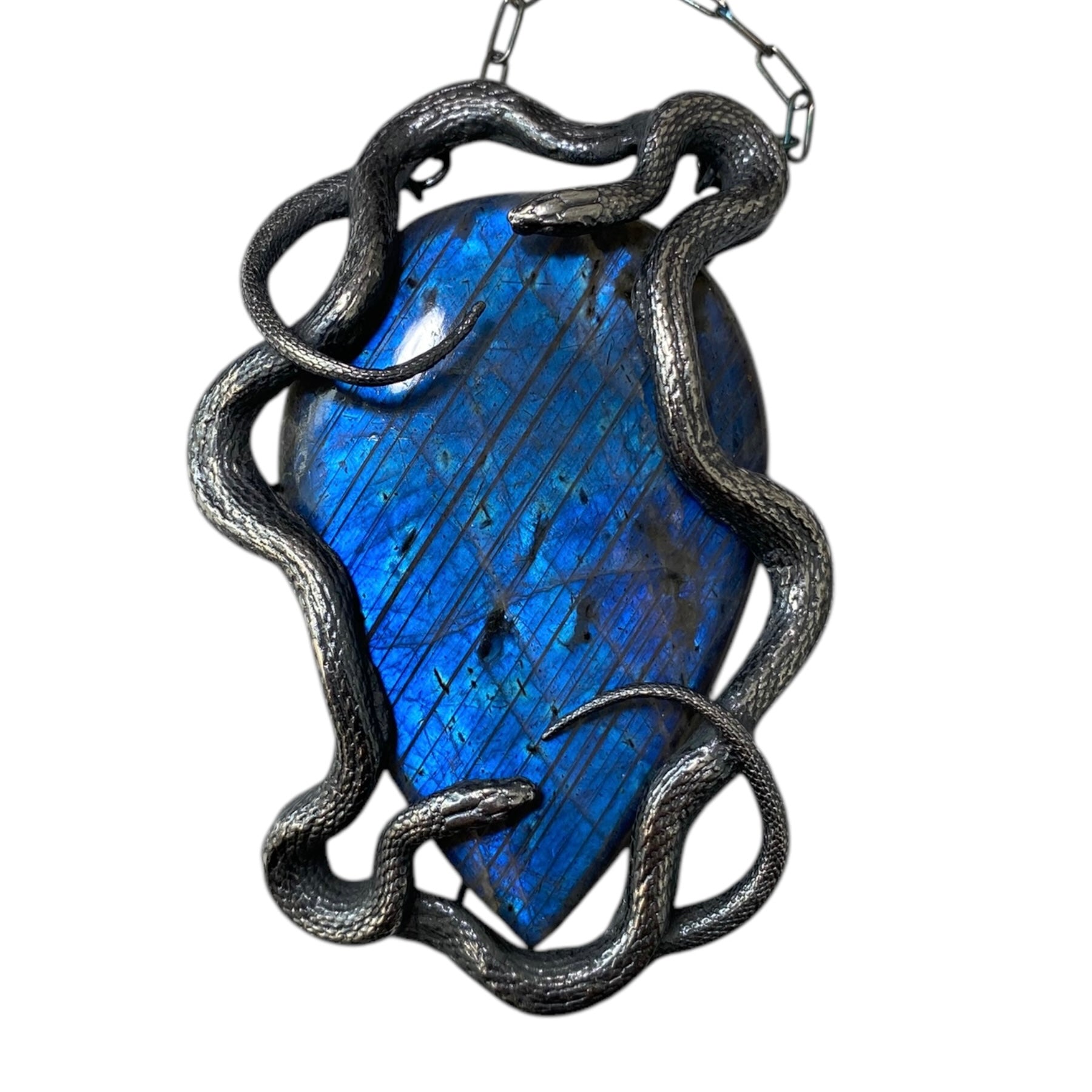 Double sterling serpents around a self pick deep blue labradorite as shown.
