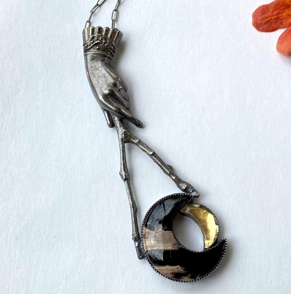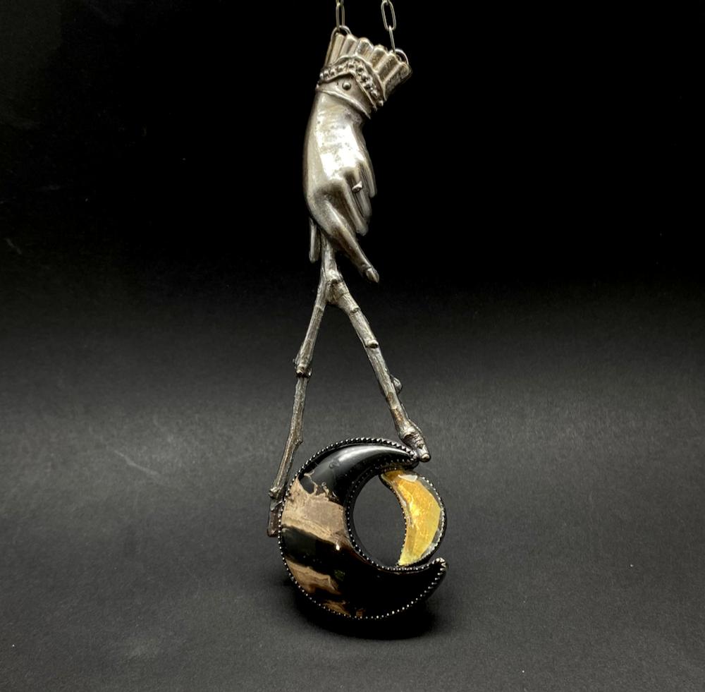 A graceful Shibuichi hand holding a dowsing rod traps a palm agate waning crescent moon paired with 23kt gold backed rock crystal waxing crescent. Suspended on a 20" long chain, perfect for layering!