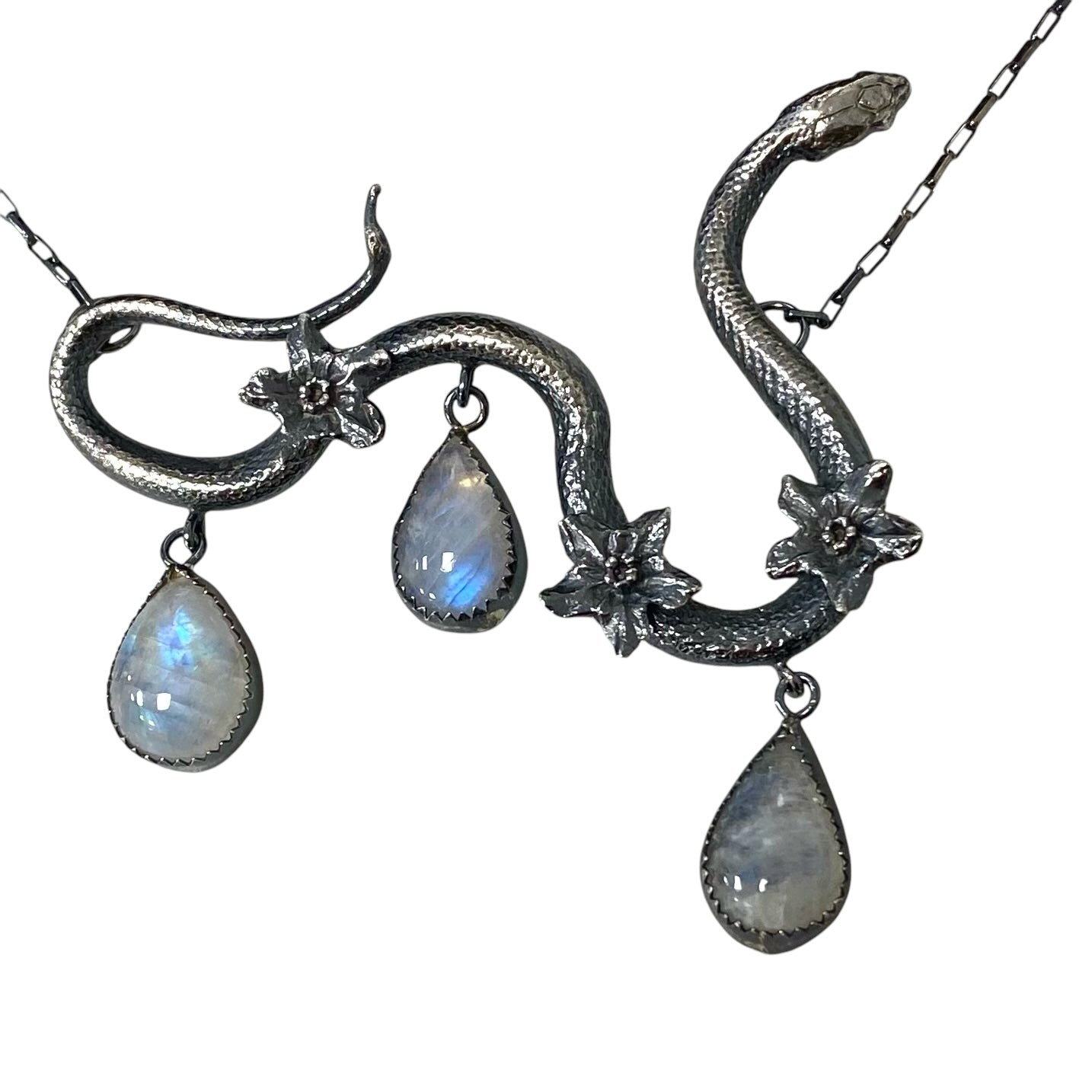 Sterling silver Snake Necklace adorned with cast silver forget me nots and dancing drops of Rainbow Moonstone