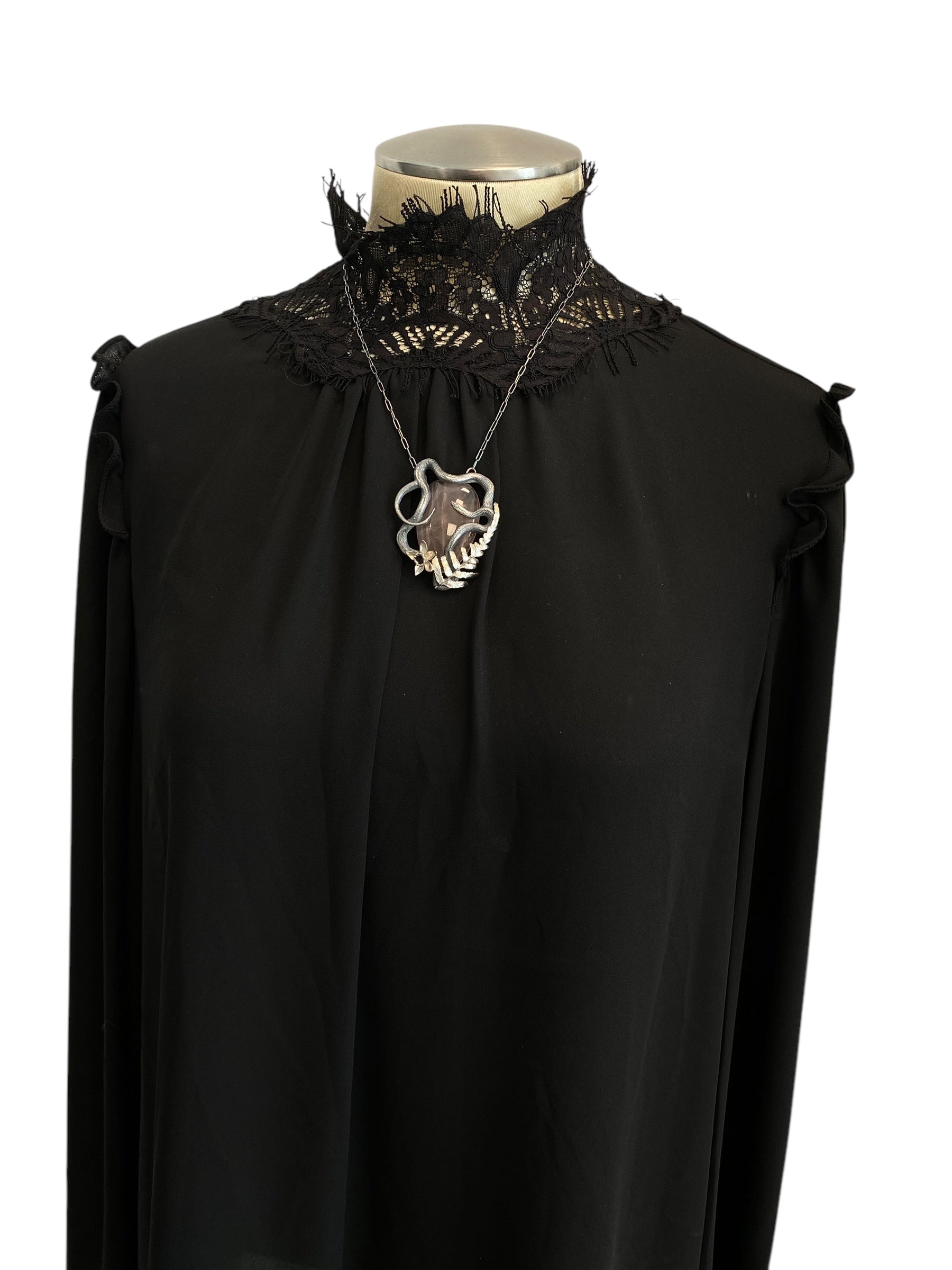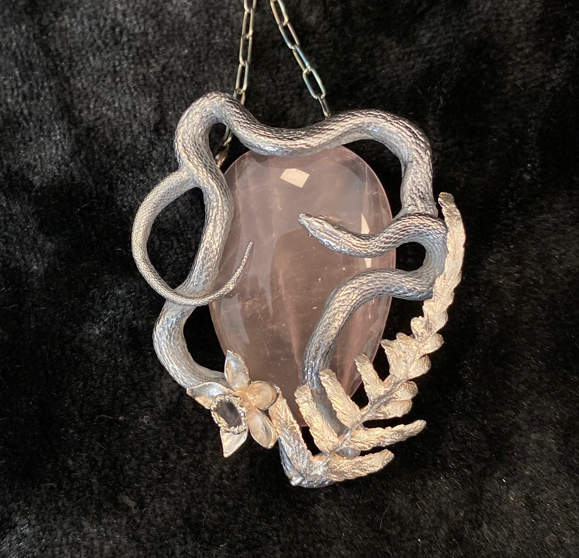 Large Rose Quartz encircled by a coiled sterling serpent entwined with natural fern and hand formed daffodil, a beautiful way to carry Spring with you throughout the year. 18" chain, this is a large pendant, please see all images to see size when worn.