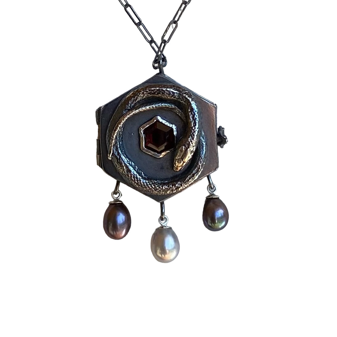 Serpent Container Locket with Crimson Garnet and Pearls