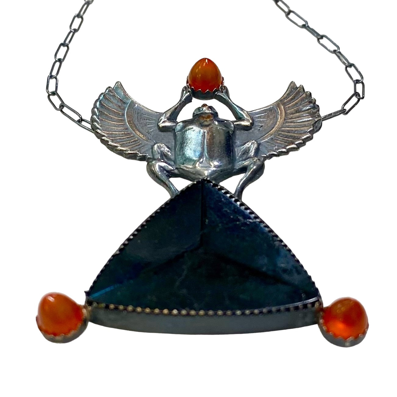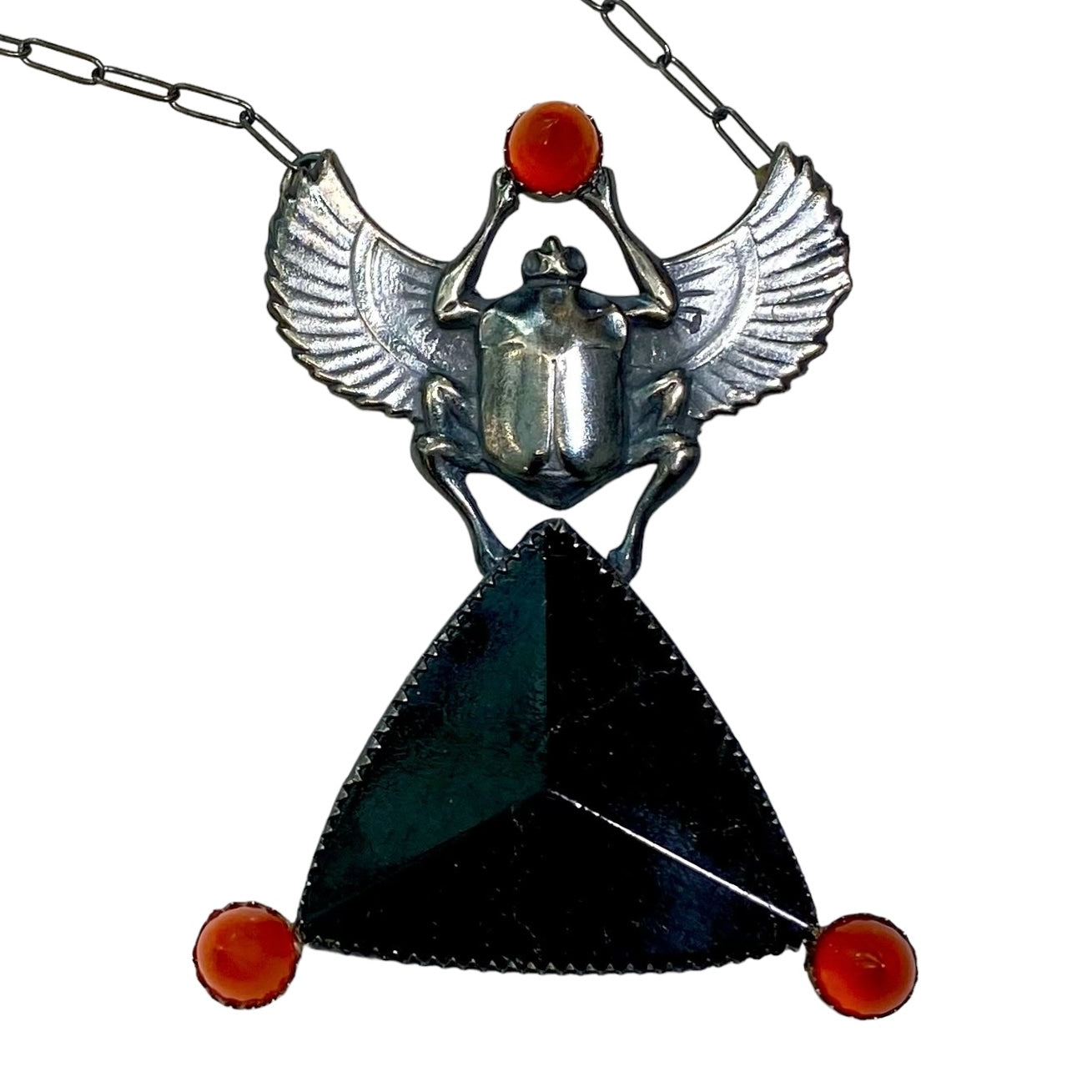 A talisman of rebirth, renewal and the cyclical nature of life. The heart of the pendant, a grounding black tourmaline in a trllion cut reminiscent of the pyramids, offering protection and stability. A trio of orange carnelians, thought to stimulate creativity, passion, and vitality.